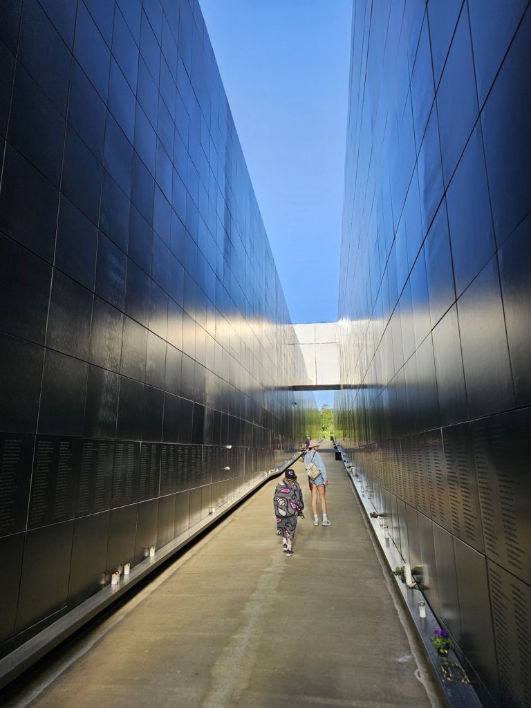 Culoarul negru se deschide într-un parc verde, ordonat până la ultimul centimetru. Acolo sunt monumente care nu te lasă să uiți: statuia mâinilor în rugăciune, un perete din beton lăsat deliberat brut – locul unde aveau loc execuțiile prin împușcare. Mesajul întregului complex nu este unul de răzbunare, ci de luciditate: iată ce am trăit; iată de ce nu ne mai putem întoarce acolo.